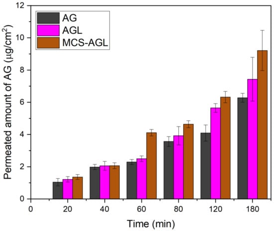 Ex vivo permeation studies of AG, AGL, and MCS-AGL. The results are expressed as mean ± SD, n = 3.