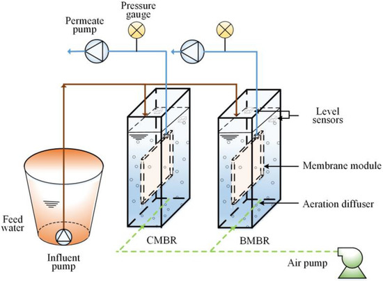 Two 6.5-L aerobic MBRs were set-up (Figure 1), with sludge inoculated from the aeration tank at a local sewage treatment plant (Hangzhou, China). The mixed liquor suspended solids (MLSS) concentration in the MBR was maintained at about 8500 mg/L. One gram per liter of biochar was added into one MBR (BMBR) and the other MBR was operated as control (CMBR). The biochar dosage was selected based on previous studies and from the economic perspectives [21]. These two MBR reactors were operated at the identical HRT for 6.2 h and SRT for 30 d. The reactor temperature was around 25.0 ± 1.5 °C during the trial. Synthetic sewage with a low C/N ratio of five was fed to the above two MBR reactors and the recipe was listed (Table S1 in Supplementary Materials).