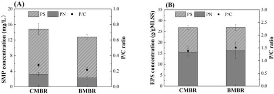 SMP and EPS are main compounds that affect membrane fouling in the MBRs [36,37]. To further evaluate the adsorption capacity of biochar, SMP and EPS concentrations were measured in both MBRs. SMP concentration in BMBR (12.76 mg/L) was lower than CMBR (14.82 mg/L) (Figure 2A,B) (p < 0.05), which is primarily the consequence of reduced protein content. The average protein concentration in BMBR was 2.03 mg/L, which was about 30% less than that of CMBR. As a result, BMBR achieved lower SMP protein/carbohydrates (P/C) ratio of 0.22 ± 0.03 than that of 0.28 ± 0.02 in CMBR, indicating a lower fouling rate in BMBR, since proteins are more hydrophobic than carbohydrates and can easily bind to membranes [4]. In other words, the added biochar suppressed the SMP concentration in the bulk sludge in favor of lower membrane fouling propensity. This is consistent with Ye’s study, who also reported less SMP and lower membrane fouling with biochar addition, although with an anaerobic membrane bioreactor [38]. However, similar average EPS concentrations of 26.84 mg/L and 26.90 mg/L were observed in CMBR and BMBR, respectively. Results revealed that the biochar addition had no discernible impact on EPS concentration in the mixed-liquor suspension.