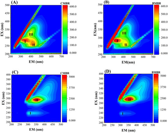 3D-EEM fluorescence spectra of SMP (A,B) and EPS (C,D) in the conventional MBR (CMBR) and biochar MBR (BMBR).