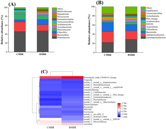Proteobacteria, Bacteroidetes, Planctomycetes and Chloroflexi were most prominent at the phylum level in the bulk sludge, occupying over 83% of the total relative abundance (Figure 6A) [40]. Proteobacteria was the predominant phyla, occupying about 45.9% and 47.3% in CMBR and BMBR, respectively, which are widely reported with the function of nitrification as well as denitrification in typical sewage treatment facilities [56]. Significantly lower relative abundance of Bacteroidetes were observed in BMBR (14.0%) compared to that in CMBR (21.5%), suggesting less EPS protein secretion in the BMBR [57,58]. This was consistent with the lower SMP P/C ratio of the BMBR (Figure 2A), which revealed its lower membrane fouling tendency. The relative abundance of Planctomycetes in CMBR and BMBR were 13.1% and 10.5%, respectively. The lower abundance of Planctomycetes in BMBR can indicate lower fouling propensity since Planctomycetes is conducive for biofilm attachment onto membrane surfaces [58].