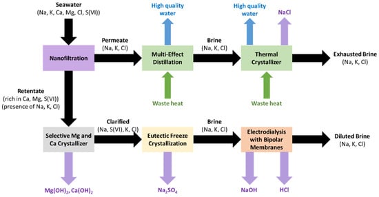 Within this context, the WATER-MINING project aims to ensure access to water by exploring alternative water sources through the development of innovative solutions that are being tested with urban and industrial wastewater and seawater desalination []. Case Study 1, placed at the seawater reverse osmosis (SWRO) of Lampedusa (Italy), evaluates the performance of innovative technologies to avoid brine discharge by their valorization into chemicals or freshwater. The treatment chain (Figure 1), with an inlet flow capacity of 2.2 m3·h−1, is composed of a nanofiltration unit treating seawater, which splits the stream in two. The permeate (mainly containing NaCl and KCl) will be sent to a multiple-effect distillation unit (employing waste heat) to produce high-quality water. The remaining brine, almost NaCl-saturated, will be treated in a thermal crystallizer to obtain high-quality water and NaCl(s). On the other hand, the nanofiltration concentrate (rich in Mg and Ca) will be sent to a selective Mg and Ca crystallizer to precipitate them as hydroxides []. The remaining solution (Na2SO4 and NaCl mixture) will be treated in the Eutectic Freeze Crystallization unit to precipitate Na2SO4(s). Finally, the residual brine (mainly NaCl) will be fed to the electrodialysis with bipolar membranes (EDBM) unit to produce NaOH and HCl that can be reused internally in the process []. The proposed treatment scheme would allow a more competitive desalination process due to the higher freshwater production and water recovery, the lower energy consumption and the production of high-purity salts (NaCl(s) and Na2SO4(s)) and chemicals (Mg(OH)2(s) Ca(OH)2(s), securing sustainable access to Mg (listed as a Critical Raw Material) within the European Union. Moreover, the volume of brine discharged to the environment will be reduced.
