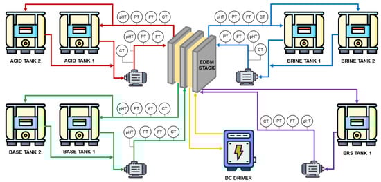 The EDBM pilot plant (Figure 2) is composed by two skid-mounted units: (i) the pumping, monitoring and control station, and (ii) the EDBM stack. The former contains the pumps to feed the solution to the stack and the instrumentation devices to monitor and control the main variables involved in the process, while the latter is composed using an EDBM FT-ED1600-3 module provided by FuMa-Tech BWT GmbH (Bietigheim-Bissingen, Germany).