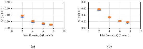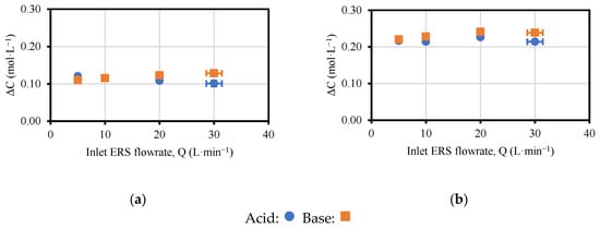 The performance in the variation of concentration profiles (Figure 6) was different between the T-200-I-ERS (Figure 6a) and the T-400-I-ERS (Figure 6b) tests. For T-200-I-ERS, the acid concentration slightly decreased when increasing the flowrate, while the base concentration slightly increased. However, the changes throughout the test were small, for both products (<0.02 mol·L−1). In T-400-I-ERS, a maximum in the variation of concentration was observed for both products (although the acid concentration was somewhat lower due to the mobility and migration of protons) for the flowrate of 20 L·min−1, which was the flowrate recommended by the supplier for the ERS channel. In this case, the changes throughout the test were very small (<0.02 mol·L−1).