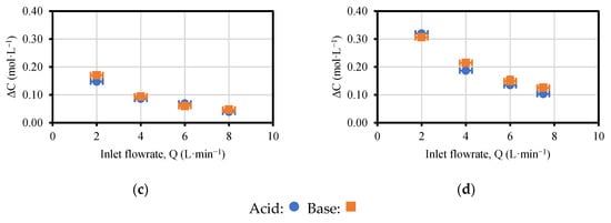 Values of concentration variation versus feed flowrate: (a) T-200-I; (b) T-400-I; (c) T-200-F; (d) T-400-F. The associated errors to the variation in the acid and base concentrations (vertical error bars), estimated via acid–base titrations, are below 3% and cannot be visualized in practice in the figure.