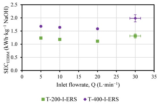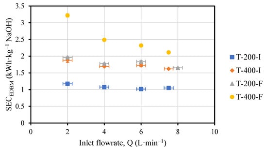 Values of SECEDBM (kWh·kg−1 NaOH) versus flowrate. Vertical error bars have been estimated via error propagation theory and are so low (i.e., <5%) that cannot be visualized in the figure.