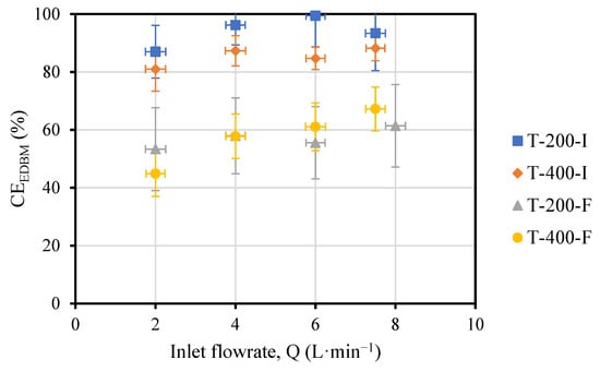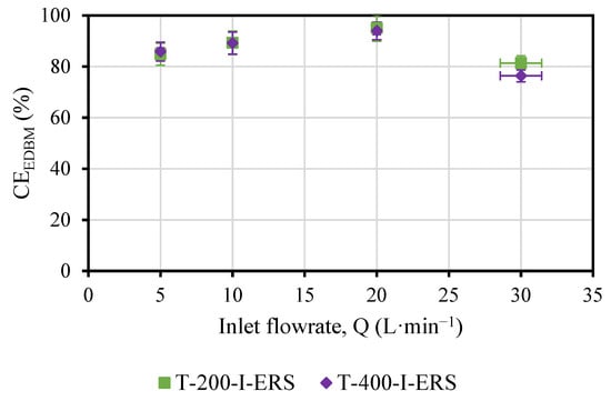 Similar behavior was observed for the T-200-I-ERS and the T-400-I-ERS tests (Figure 8), where a maximum in the CEEDBM was observed for the flowrate of 20 L·min−1 (nominal flowrate). The changes in CEEDBM throughout the test were <13% for T-200-I-ERS and <5% for T-400-I-ERS. The changes in the CEEDBM by doubling the current density were minimal (<5%) since twice the variation of the concentration was achieved.