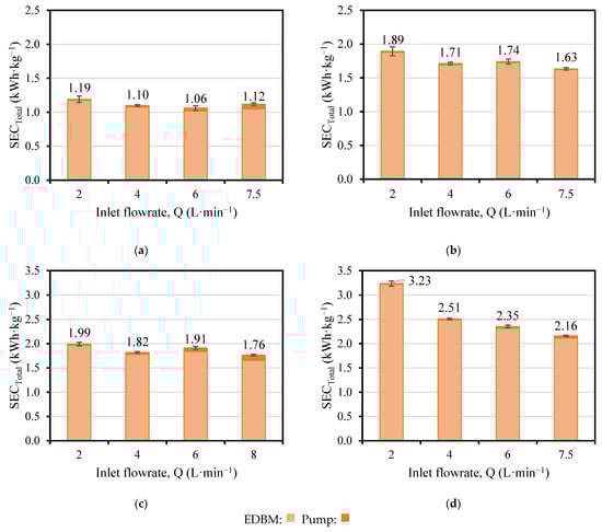 Increasing the flowrate by definition increases the pumps consumption (Equation (3)), and therefore the SECPump, as seen in Figure 9 and Figure 10. Although the SECPump presented values two orders of magnitude lower than the SECEDBM, it may have an impact on the estimation of the SECTotal given that the SECEDBM presents values with small variations, but with a growing trend regarding the increase in flowrate. In particular, the contribution of the SECPump to SECTotal in the tests employing 200 A·m−2 current density (T-200-I and T-200-F) was in the range of 1.3–6.9%, while in the 400 A·m−2 current density tests (T-400-I and T-400-F) it was in the range of 0.5–2.3%.