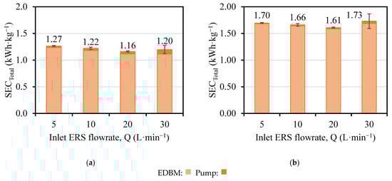 For the tests in which the ERS channel flowrate has been manipulated (T-200-I-ERS and T-400-I-ERS), different trends for the SECTotal were reported, with a decreasing trend for the increase in the flowrate in T-200-I-ERS (Figure 10a), while in T-400-I-ERS (Figure 10b) a minimum value for SECTotal was obtained in the nominal flowrate (20 L·min−1). Contributions of 3.2–6.4% and 1.2–2.3% for tests T-200-I-ERS and T-400-I-ERS were respectively obtained.