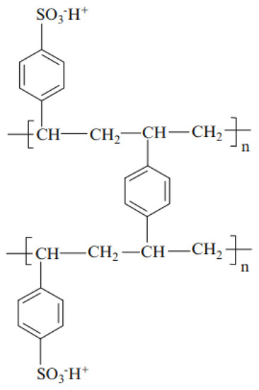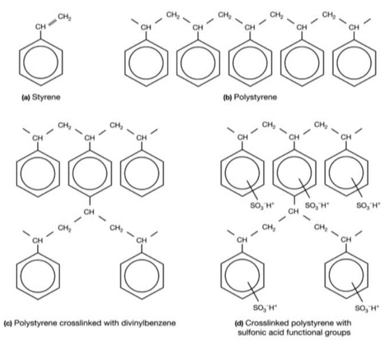 The chemical microstructure of these three membranes is the same and can be represented by Figure 1 [45,46]. Here, we have given only the structure of the active polymer. A PVC weave is used to support this polymer and to reinforce the mechanical properties of the membrane [47,48]. Figure 2 illustrates the different synthesis steps of these membranes [49]. Here, the matrix of synthetic ion-exchange membrane is based on (a) styrene that forms (b) polystyrene chains. The resin matrix (c) consists of polystyrene chains cross-linked with divinylbenzene. To this matrix, functional groups are added. Panel (d) shows the membrane structure of a strong cation exchange membrane containing sulfonic acid functional groups.