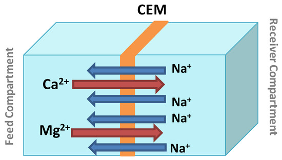 We prepared one-component solutions from MgCl2·6H2O or CaCl2·2H2O salts (Sigma-Aldrich, St. Louis, MO, USA). These solutions constitute the feed compartment, and their final concentrations of Ca2+ or Mg2+ vary from 10 mg·L−1 to 200 mg·L−1. As a receiver, we used NaCl solution (Sigma-Aldrich) with Na+ concentrations varying from 0.1 mol·L−1 to 2.0 mol·L−1. All the reagents are commercially available as analytical grades and used without further purification.