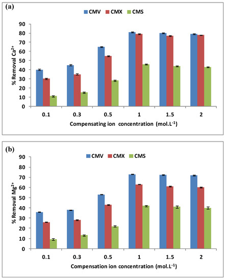 The effect of the compensating ion, here Na+, was examined for the removal of hardness. During the DD operation, the Na+ concentration varied from 0.1 mol·L−1 to 2.0 mol·L−1 when the initial concentrations in the feed compartment were equal to 100 mg·L−1 for each Ca2+ and Mg2+ cations, and the stirring rate was maintained at 500 rpm. The three membranes CMV, CMX, and CMS have been tested for a period of 3 h each. Figure 4a,b present the variations of Ca2+ (a) and Mg2+ (b) removal versus the compensating ion concentration.