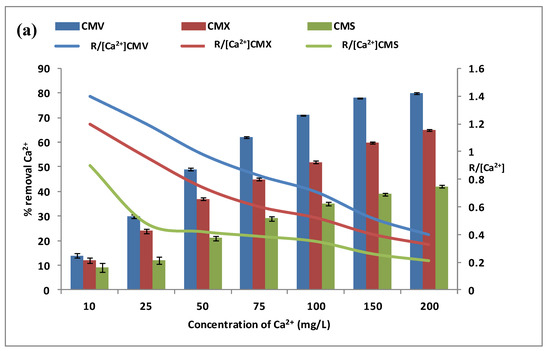Figure 5a shows that calcium flux through any CEM increases with the increase of calcium concentration from 10 mg·L−1 to 200 mol·L−1. The transport of calcium is very low at 10 mg·L−1 with a removal efficiency of 14.0 ± 0.9% for CMV, 12.0 ± 1.2% for CMX, and 9.0 ± 1.8% for CMS. The [Ca2+] concentration then increases from 10 mg·L−1 to 200 mg·L−1 and contributes to maintaining the concentration gradient of calcium high involving an improvement of the cross-ion transfer between Na+ and Ca2+. To explain the calcium diffusion through the membrane, the specific removal rate (SRR) ratio for the three membranes is presented as the curves in the same Figure 5a. According to the SRR, it seems that Ca2+ diffusion through the membrane was performed with the cross-exchange of Na+ at low concentrations, but at high concentrations, the membrane loses its performance, and, as a result, leakage without exchange is induced. Thus, it can be concluded that as the calcium concentration increases, the removal of calcium improves but in a less efficient way [29].