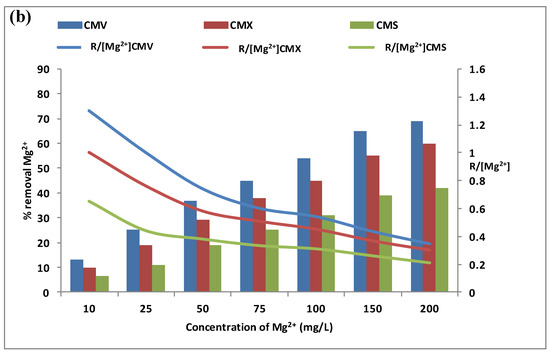 Effect of Ca2+ (a) and Mg2+ (b) concentration in the feed compartment on their removal rates (vertical bars) and on the (curves). Na+ concentration in the receiver was equal to 0.5 mol·L−1, and the stirring speed was maintained at 500 rpm.