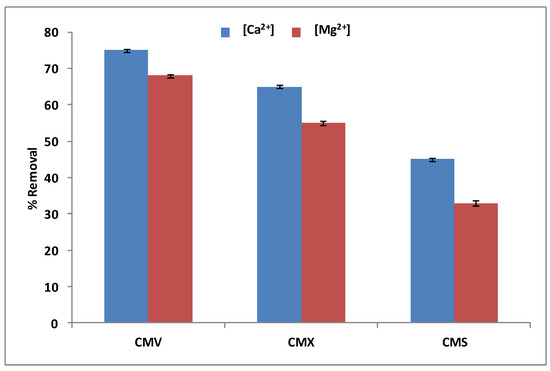 According to Figure 6, the CMV membrane has the best removal rates of calcium (75 ± 0.32%) and magnesium (68 ± 0.38) simultaneously, compared to the CMX membrane, which has removal rates of almost 10–13% under those of the CMV (65 ± 0.37% and 55 ± 0.47% for Ca2+ and Mg2+, respectively), and the CMS membrane, which has almost 30% less in the removal rates of the same two cations. In fact, the CMV membrane presents a higher permeability to monovalent than bivalent cations with a high ion-exchange capacity of 2.5 meq.g−1, and the highest water content of 39%. These properties facilitate and accelerate the transport of calcium and magnesium from the feed compartment to the receiver compartment. CMX has a high thickness of 170 μm and a low water content of 25%, therefore, it diplays the lowest rate of calcium and magnesium removal. The CMX membrane shows a lower permselectivity of Na+ relative to Ca2+ and Mg2+ compared to the CMS membrane. This is certainly because of the surface treatment (see Table 1), which makes it very selective to monovalent cations and much less to divalent cations [51]. Wisniewski et al. [33] confirmed that the CMV membrane is effective compared to the CMX one for the elimination of selected anions and cations from water by means of Donnan Dialysis. Therefore, the CMV membrane has been selected for the next study.