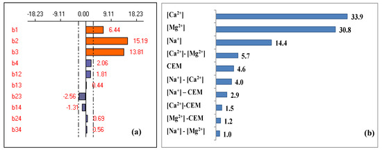 It can be seen from Figure 7 that three factors are significant and have a positive effect on the response implying that the hardness removal efficiency improves as these factors increase. Moreover, only the [Ca2+]-[Mg2+] interaction is significant (b23 = −2.56) with a negative effect on the response, while all other interactions are not significant with a negligible effect on the response.