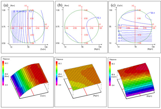 Figure 8a presents the effect of interactions between [Ca2+] and [Na+] at a fixed [Mg2+]. It shows that the maximum of hardness removal is reached for [Na+] varying from 0.5 to 1 with [Ca2+] up to 55 mg·L−1. This is explained by the fact that the concentration gradient of the counter-ions increases, hence the cross-ion transfers between two Na+ ions and one Ca2+ to maintain electroneutrality. As shown in Figure 8b, at a fixed [Ca2+], hardness removal efficiency increases with an increase of [Mg2+] for [Na+] of around 0.75 mol·L−1. The shape of the contour plots shows little improvement in hardness removal. This was expected because the [Na+]-[Mg2+] interaction was the lowest. Figure 8c shows that at a fixed [Na+] hardness, removal increases as [Ca2+] and [Mg2+] increase. It is worth noting that the increase of calcium concentration contributes to maintaining the gradient concentration of calcium and magnesium high involving an improvement of cross-ion transfer.