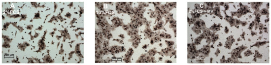 Cells were cultured according to ATCC (USA) guidelines. All experiments with cells were carried out in a humid atmosphere at 37 °C with 5% CO2. Cell viability after subculture and after culture in the presence of MVs was assessed using trypan blue and propidium iodide staining [53] and found to be more than 95%. While working with MVs, all solutions, culture media, and fetal calf serum were sterilized by passing through filters with a pore diameter of 0.2 μm (Sigma, St. Louis, MO, USA) [54].