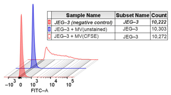 When intact JEG-3 cells were cultivated in the presence of MVs obtained from CFSE-stained NK-92 cells (JEG-3 + MV\CFSE), the fluorescence level of JEG-3 cells increased relative to the level of autofluorescence of unstained JEG-3 cells (negative control) and the fluorescence of cells cultured with MVs derived from unstained NK-92 cells (JEG-3 + MV/unstained) (Figure 2).