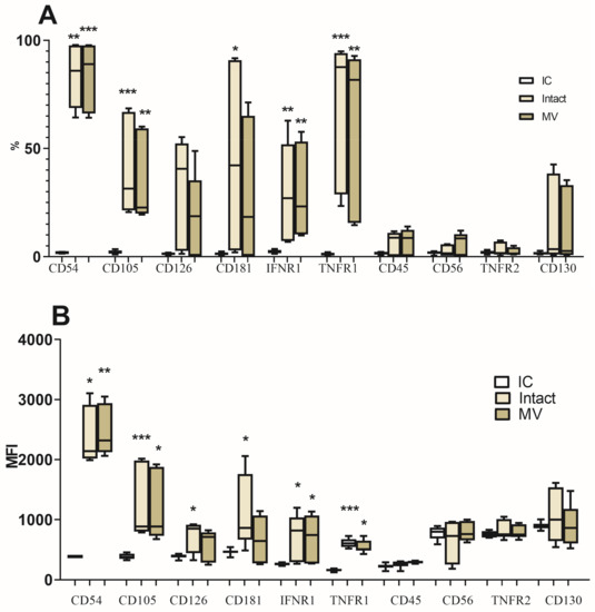 Expression of receptors by JEG-3 cells: (A) The relative number of cells expressing receptors (%); (B) The mean fluorescence intensity of receptor expression (MFI) (n = 4). Isotype control (IC): JEG-3 cells treated with isotype antibodies. Intact cells (Intact): JEG-3 cells incubated in medium without MVs added. MV: cells of JEG-3 line incubated in the presence of MVs of NK-92 cells. Significant difference from JEG-3 cells treated with isotype antibodies: * p < 0.05, ** p < 0.01, *** p < 0.001.