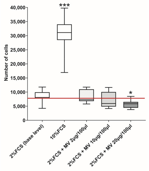 JEG-3 cells proliferate in the presence of MVs (n = 3). 2% FCS: baseline number of cells in the presence of medium supplemented with 2% FCS (marked with horizontal red line). 10% FCS: the number of cells in the presence of medium supplemented with 10% FCS. MV 2 μg/100 μL, 10 μg/100 μL, 20 μg/100 μL: the number of cells in the presence of MVs of NK-92 cells at protein concentration per 100 μL of medium with 2% FCS added (2, 10, 20 μg/100 μL, respectively). Significance of differences from baseline: * p < 0.05; *** p < 0.001.