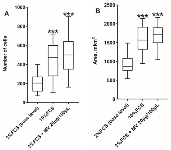 As a result of the cultivation of JEG-3 cells in the presence of MVs derived from NK-92 cells with a total protein content of 20 µg/100 µL, an increase in the migration of JEG-3 cells compared with cultivation without MVs was observed, which is due to an increase in the number of migrating cells and the area occupied by cells (Figure 5). The MV concentration of 20 µg/100 µL was selected because an effect of MVs on the proliferation of JEG-3 cells was only observed at this concentration.