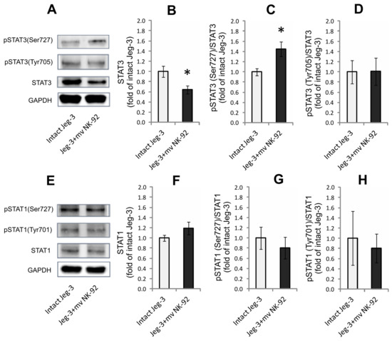 Effect of NK-92 cell MVs on content of STAT1 and STAT3 proteins and their phosphorylated forms in JEG-3 cell lysates. Immunoblot shows content of (A) STAT3 and (E) STAT1 in intact JEG-3 cells and after their interaction with NK-92 cell MVs. Band density of (B) total STAT3 and (F) STAT1 content in intact JEG-3 cells and after interaction with NK-92 cell MVs, normalized by GAPDH. Ratio of (C,D) phospho-STAT3 (pSTAT3(Ser727), pSTAT3(Tyr(705)) and total STAT3 (n = 3) and (G,H) phospho-STAT1 (pSTAT1(Ser727), pSTAT1(Tyr(701)) and total STAT1 (n = 4) in studied samples. Significant differences between JEG-3 cells treated with NK-92 cell MVs and intact JEG-3 cells: * p < 0.05.