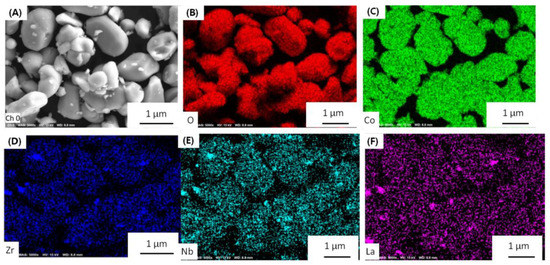 (A) selected particles, and elemental O (B), Co (C), Zr (D), Nb (E), and La (F) mapping of LLZO&LNO@LCO.