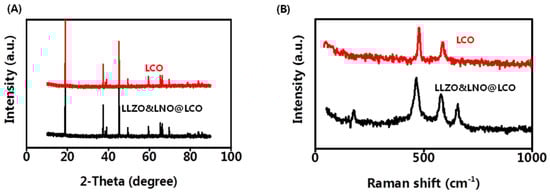 XRD pattern (A) and Raman spectra (B) of LLZO&LNO@LCO and LCO.