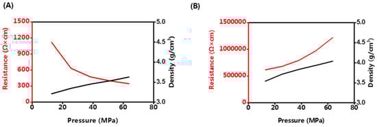 Until now, all of the all-solid-state batteries worked under pressure. Cathode materials may have different discharging capacities under different pressures. The density and volume resistance of LCO and LLZO&SLNO@CLO were analyzed at room temperature, as shown in Figure 5. The density of LLZO&LNO@LCO was lower than that of LCO under the same pressure because LCO has a regular structure and packs tightly, and LLZO&LNO@LCO is rough.