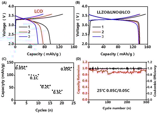 The composite cathodes were obtained by mixing cathode powders and LPSC powders at a 7:3 ratio. The typical bulk-type all-solid-state batteries were applied for the electrochemical test. The areal density of cathode materials was 8.9 mg/cm2. The Li-In alloys with high anode/SEs interface stability were used as anodes. The SSE membrane was fabricated at 360 MPa for 1 min. The cathode layer was fabricated at 60 MPa for 10 min. The electrochemical performance tests of all-solid-state batteries were conducted in the voltage range between 2.0 and 3.7 V (versus Li+/Li-In) using Land CT3002A at room temperature. The capacity-voltage profiles of LLZO&LNO@LCO||LPSC||Li-In and LCO||LPSC||Li-In are shown in Figure 6. The charging and discharging capacities of LLZO&LNO@LCO were evaluated at various C-rate from 0.05 C to 0.5 C. The discharging capacity of LLZO&LNO@LCO at 0.05 C was 138.8 mAh/g with a coulombic efficiency of 89.6% at the first cycle. Comparatively, the LLZO&LNO@LCO exhibited a higher specific capacity and coulombic efficiency than LCO at the first three charging and discharging cycles because of the coating layers. The discharging capacities of LCO faded very fast because of the side reaction between the cathode and LPSC. The LLZO and LNO coating layers can suppress the side reaction between cathode and LPSC. Therefore, more Li ions can be inserted back into the structure during discharging. The discharging capacity of LLZO&LNO@LCO is similar to previous results, for example, LCO exhibited an initial capacity of about 130 mAh/h at 0.05 C [27]. Additionally, LLZO&LNO@LCO||LPSC||Li-In had less voltage polarization. LCO||LPSC||Li-In had a higher voltage polarization and fast capacity fade. As the rate increased, charging and discharging capacities of LLZO&LNO@LCO gradually decreased. LLZO&LNO@LCO delivered discharge capacities of at 138.8 mAh/g, 101.8 mAh/g, 60.2 mAh/g, and 40.2 mAh/g at 0.05 C, 0.1 C, 0.2 C, and 0.5 C, respectively, under room temperature, and better capacity retentions of 98% after 300 cycles at 0.05 C. However, the discharging capacity of LCO||LPSC||Li-In decreased quickly from 96 mAh/g to 62.4 mAh/g after three cycles and exhibited much poorer cycling performance at 0.05 C. The fast capacity fade can be attributed to the side reaction between LCO and LPSC, resulting in the incomplete lithium-ion de/intercalation in the crystal lattice.