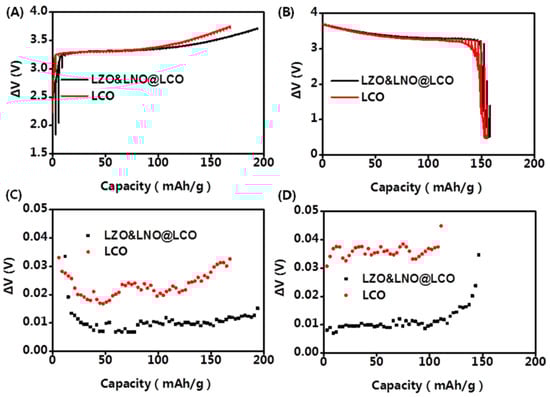 The GITT curve of the first cycle is shown in Figure 8. The potential difference of the LLZO&LNO@LCO and LCO at 0.1 C can be calculated. The Li+ insertion–extraction process is dominated by diffusion behavior. The diffusion coefficients of Li ion can be calculated by Equation 1. As shown in Figure 8, the electrochemical polarization of LLZO&LNO@LCO was less than LCO. The DLi+ of LLZO&LNO@LCO was 1.23 × 10−9 cm2/s, much higher than that of LCO 4.62 × 10−10 cm2/s. In a word, the LLZO&LNO@LCO electrode exhibited an excellent rate capability, attributed to its relatively small electrochemical polarization and stable Li+ diffusion coefficients [28].