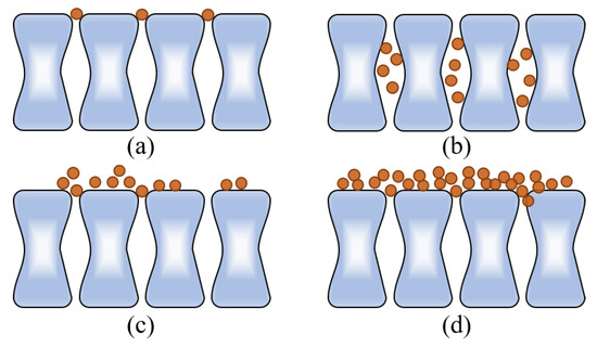 Four types of membrane fouling models. (a) Complete blocking, (b) standard blocking, (c) intermediate blocking, and (d) cake filtration.
