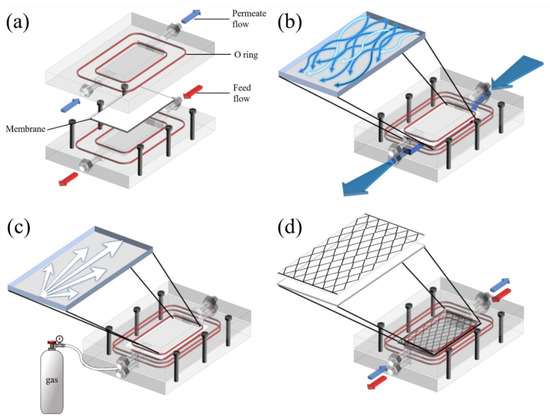 Schematic diagrams of (a) the DCMD module and fouling control methods; (b) water flushing was conducted for 1 min at 1 h intervals with a 2.5 L min−1 flowrate; (c) air backwashing was performed for 1 min every 1 h with 100 kPa of air pressure; and (d) a membrane spacer was made of 45° woven square patterned PLA.