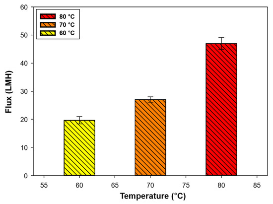 Baseline test results. Water fluxes at feed temperatures of 60, 70, and 80 °C (permeate temperature was maintained at 20 °C, and feed and permeate flow rates were 1.0 L min−1).