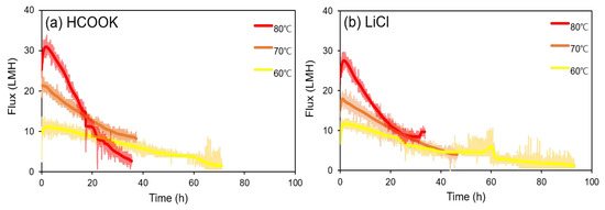 LD regeneration tests were conducted, and fluxes according to time and membrane fouling were analyzed. Before conducting a legitimate test, the membrane was subjected to DI water distillation for 30 min to stabilize the membrane in the module and facilitate reproducible research. Again, as the optimum LD concentrations are approximately 70 wt% and 40 wt% for HCOOK and LiCl, respectively, LDs were regenerated from half of the optimal concentration, assuming a situation that absorbs moisture in the air [24]. Therefore, HCOOK (35 wt%) and LiCl (20 wt%) were concentrated with DCMD at feed temperatures of 60, 70, and 80 °C with a 1 L initial feed solution volume (Figure 5).
