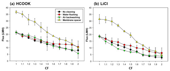 LDs were regenerated using MD with no cleaning to accurately observe the effect of cleaning. As shown in Figure 7, the flux decline rate was similar, but the average flux of HCOOK was higher than that of LiCl. This means that the regeneration time for LiCl was approximately 17 h longer. As the fouling of HCOOK was cake formation, but LiCl fouled on the membrane as intermediate and standard blocking, fouling control methods were expected to be differently effective.