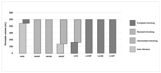 The fouling mechanism data in terms of permeate volume with no cleaning and physical cleaning methods. LDs were expressed as HCOOK to HK and LiCl to LC. LDs with cleaning methods were abbreviated to HKN for HK with no cleaning; HKWF for HK with WF, HKAB for HK with AB, and HKSP for HK with SP. Similarly, LCN for LC with no cleaning, LCWF for LC with WF, LCAB for LC with AB, and LCSP for LC with SP.