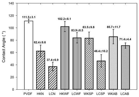 Contact angle results. PVDF is the CA result of the virgin membrane before MD operation. LDs were expressed as HCOOK to HK and LiCl to LC. LDs with cleaning methods were abbreviated to HKN for HK with no cleaning, HKWF for HK with WF, HKAB for HK with AB, and HKSP for HK with SP. Similarly, LCN for LC with no cleaning, LCWF for LC with WF, LCAB for LC with AB, and LCSP for LC with SP.