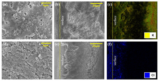An SEM and SEM-EDS image of LiCl and HCOOK after no cleaning concentration. (a,d) are surface SEM images of HCOOK and LiCl. (b,e) are cross-sectional SEM images of HCOOK and LiCl. (c,f) are cross-sectional SEM-EDS images of HCOOK and LiCl.