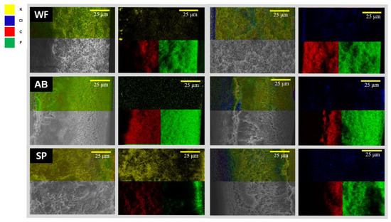 The SEM-EDS results were utilized to analyze the accumulation of LDs on the surface and inside the membrane. As shown in Figure 10, HCOOK was fouled as cake filtration, and LiCl was fouled as intermediate blocking. In the analysis, the distribution of LDs was visually recognized by expressing different colors for each chemical element (C, O, K, and Cl), while F (one of the PVDF membrane elements) is expressed in green. Both LDs were evenly distributed on the membrane surface, and the analysis of the cross-section in the membrane confirmed that HCOOK easily penetrated and was distributed evenly inside the membrane, but LiCl rarely penetrated and was distributed thickly only on the membrane surface. Thus, whether cleaning methods could effectively remove fouling could be determined by comparing the difference between the SEM-EDS results before and after cleaning (Figure 9 and Figure 10).
