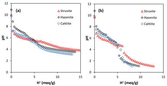Titration curves for the acid dissolution of the MgP salts (struvite, hazenite and cattiite) using citric acid (a) and nitric acid (b). Dilution ratio: 28 g salt per liter of water.