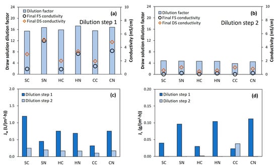 The FO dilution tests were performed in two sequential steps. In the first step, high DS dilution was reached, equivalent to a dilution factor of about 16 times (Figure 2a). In the second step, an additional dilution factor of around four times was achieved (Figure 2b), leading to an overall dilution factor of above 60 times (Figure S1 in Supplementary Materials). By the end of the second dilution step, DS and FS conductivities reached similar values (<1.5 mS/cm), attesting that the system had nearly reached the osmotic equilibrium, and that no more water could be extracted with the nutrient solution. In fact, when looking at the water permeation flux (Figure 2c and Figure S2 in Supplementary Materials), low values were reached even during the first dilution step. This fact can be explained by the rapid dilution of the concentrated DS. Consequently, the DS partly lost the osmotic potential during the first hours of the FO process, leading to low permeation flux, so the overall filtration time took longer than 25 h to reach the targeted volume (Figure S2 in Supplementary Materials). Thus, such long filtration time was inherent to the setup design; from the industrial scale-up point of view, it may result in high membrane area requirements to achieve the proposed dilution in less time.