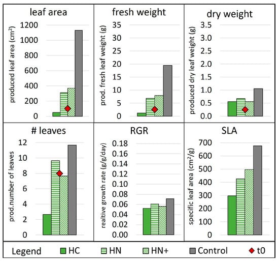 Plant growth parameters in week 3 of cycle 1. Number of leaves, leaf area, fresh and dry weight at t0 are indicated as red dots while the additionally produced quantities after 21 days are indicated as bars. Abbreviations: RGR, relative growth rate; SLA, specific leaf area. Reference for MgP salts: H, hazenite. Reference for acids: C, citric acid; N, nitric acid. +, supplemented with KNO3.