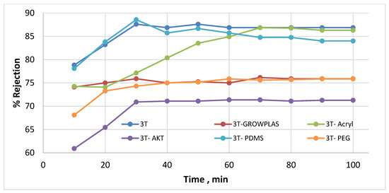 3T % rejection variation with permeation time for different irradiations.