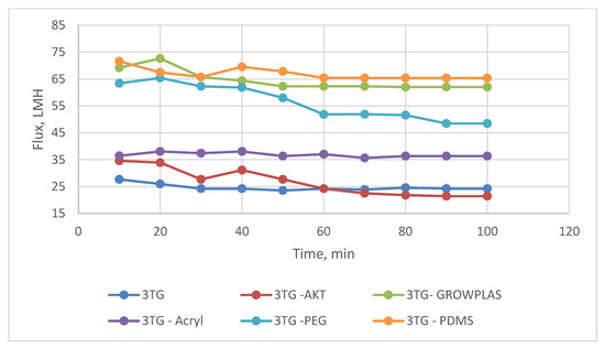 3TG membrane flux with permeation time with foulant solution.