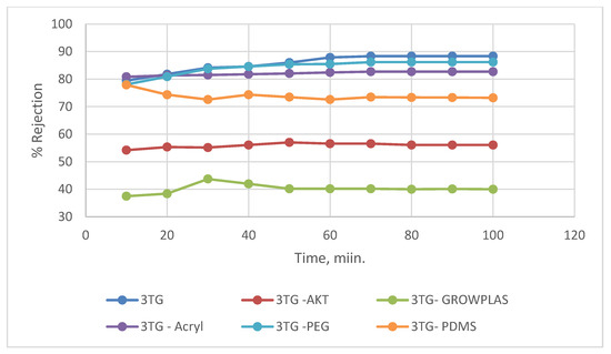 3TG % rejection variation with permeation time for different irradiations.