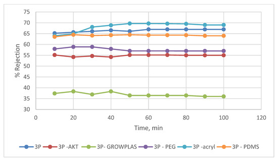 3P % rejection variation with permeation time for different irradiations.
