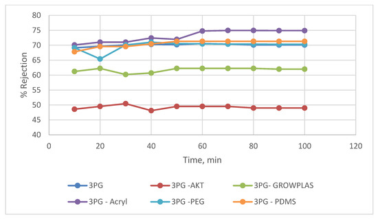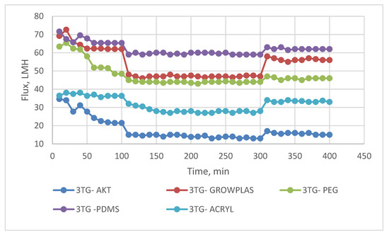 The permeate flux shown in Figure 6 has shown that the maximum value of 65 LMH was reached for both 3TG-PDMS and decreased to reach 62 LMH for 3TG-GrowPLAS and about 52.5 LMH for 3TG-PEG. From Figure 8, SEM morphologies can help in the interpretation of such findings, as PDMS and PEG show a similarity in their top structures of open circles when compared to the closed, dense structure in 3TG-Acryl. On the other hand, for 3TG-GrowPLAS, the increase in flux was coupled with the sharp decline in rejection percentage. This can be easily explained by the deep cracks found on its top surface, denoting the etching of the PA layer (Figure 6).