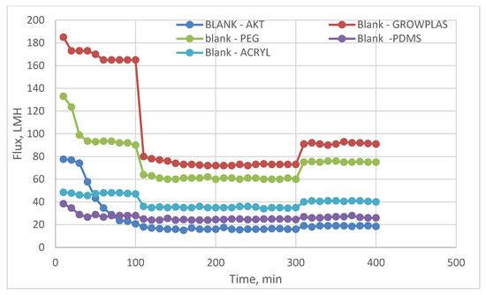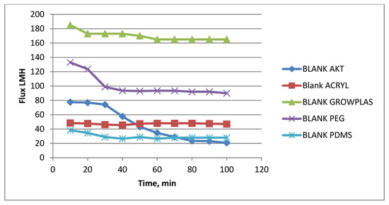 Blank flux decline with permeation time for different fouling media.